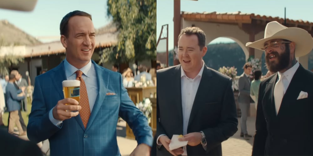 Ex-astro do futebol Peyton Manningcomédia Shane Gillise uma cantora Post Malone todos ficaram olhando para o comercial onde estavam todos no casamento com um barril de cerveja.