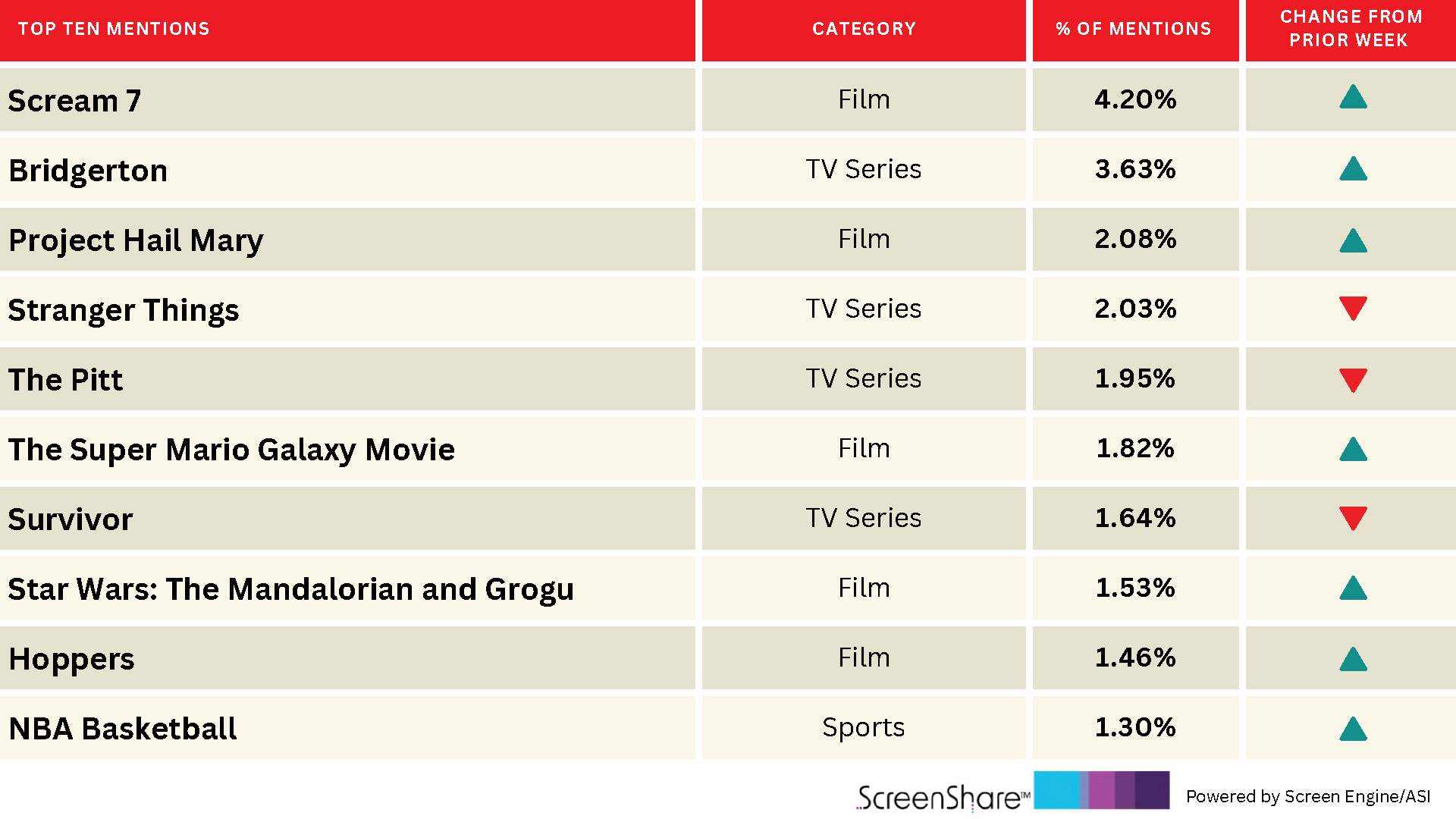 ScreenShare, uma parceria de dados entre Screen Engine/ASI e TheWrap, rastreia as 10 opções de entretenimento mais mencionadas a cada semana e se cada uma ganhou ou perdeu impulso em comparação com a semana anterior. O gráfico está localizado na página Dados e Análise do WrapPRO Members Hub.