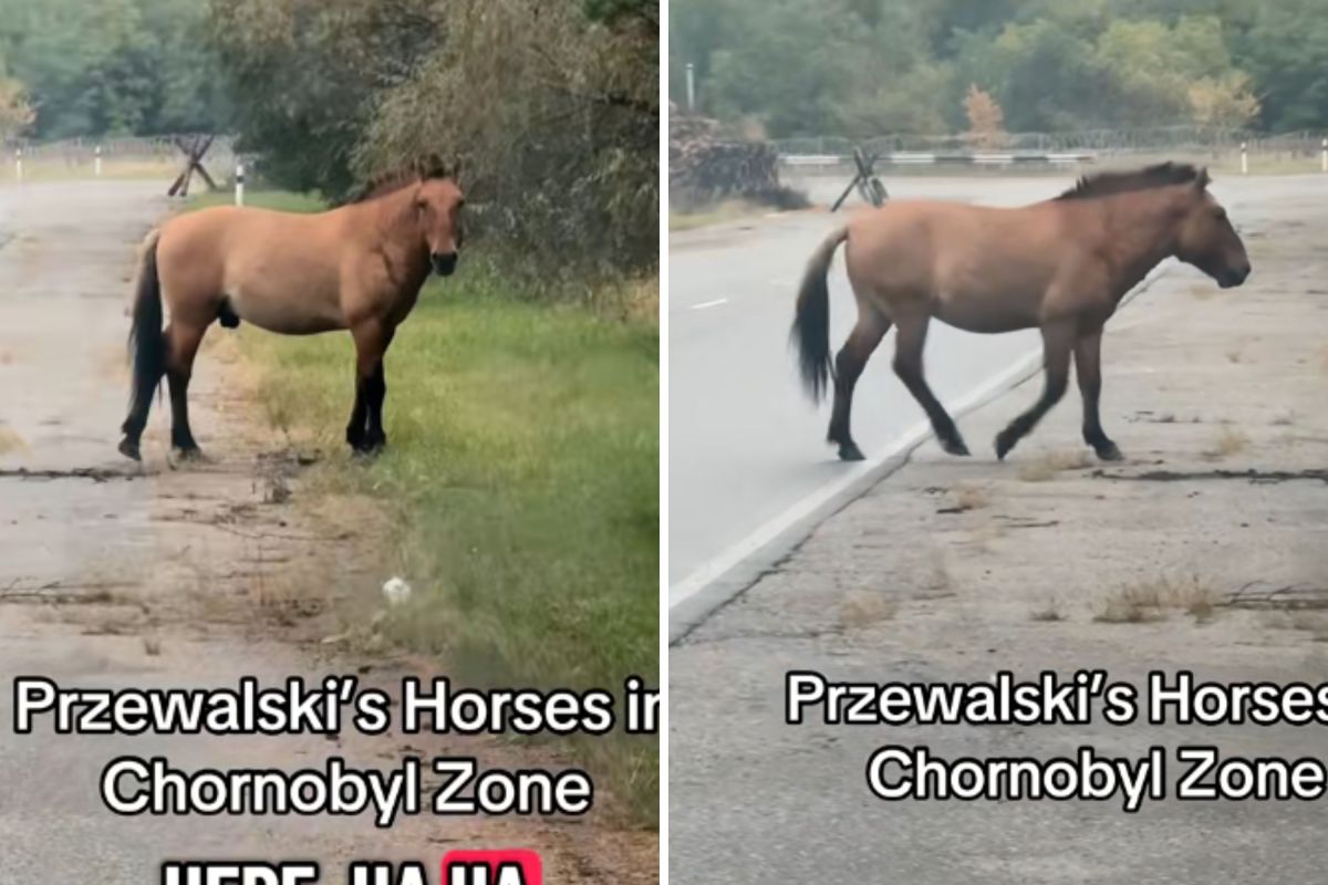 A equipe Dogs of Chernobyl faz parte do Clean Futures Fund, uma comunidade sem fins lucrativos que apoia aqueles que sofrem os efeitos de longo prazo de desastres nucleares. Eles ficaram surpresos ao ver o cavalo de Przewalski passando pela Zona de Exclusão de Chernobyl. Cobrindo uma área de 1.600 milhas quadradas após a explosão catastrófica de 1986, a equipe registrou o raro momento e postou-o no TikTok (@dogsofchernobyl), onde já ultrapassou 8,3 milhões de visualizações.
