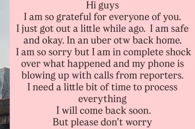 Mais tarde, na quinta-feira, ela postou em sua história no Instagram: “Olá amigos. Estou muito grata a todos vocês. Já estou fora há um tempo. Estou segura e bem, pegando um Uber para casa. Sinto muito. Mas fiquei chocado com o que aconteceu e meu telefone explodiu com ligações de repórteres. Preciso de um pouco de tempo para processar tudo. Voltarei em breve, mas por favor, não se preocupem.”